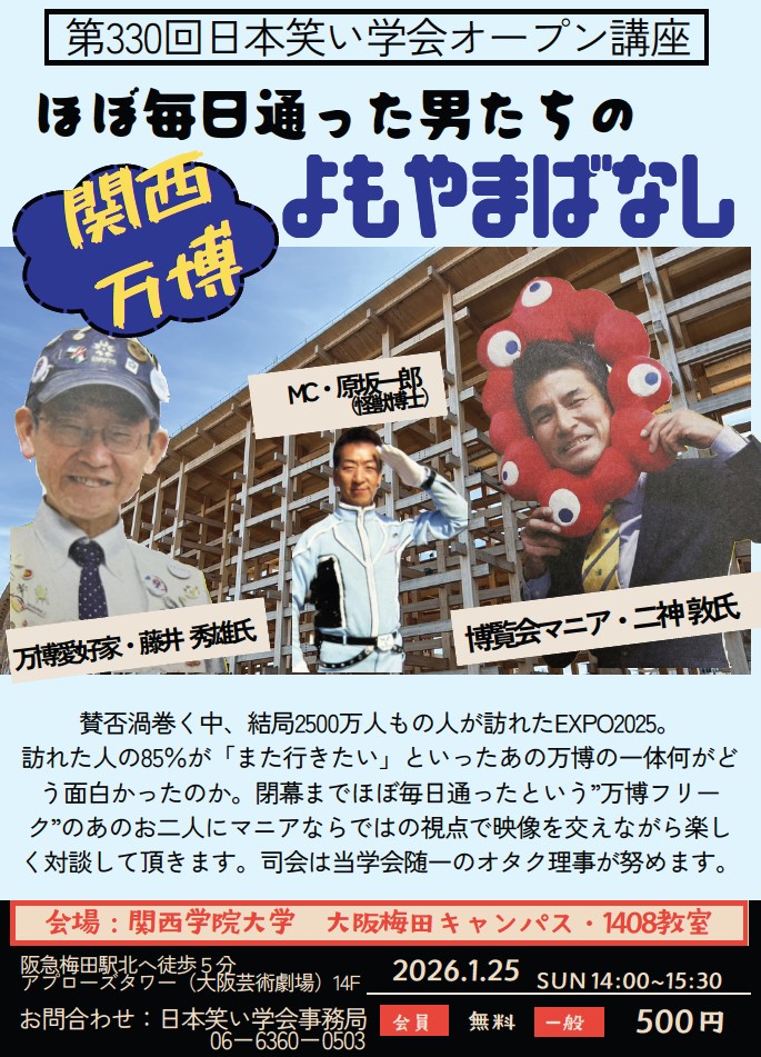 日本笑い学会事務局(予約不要) https://www.nwgk.jp/im_form/contact.html (※お問合せは、学会事務局にお願いします) |